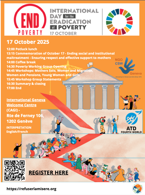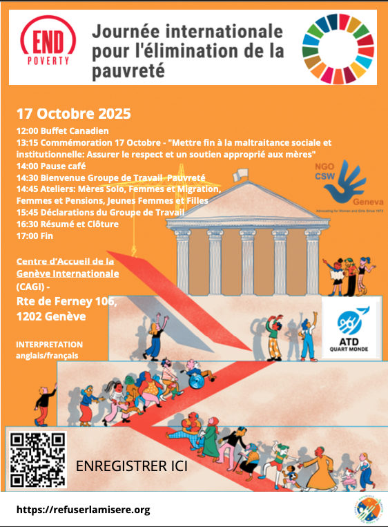 The NGO CSW Geneva Task Force on Poverty seeks to enhance the cooperation of the members of NGO CSW Geneva on SDG # 1 “No Poverty”. Sustainable Development Goal 1, established by the United Nations in 2015, calls for the end of poverty in all forms. The Task Force plans to strengthen relations with the representatives of the Working Group on the Right to Development which meets annually in Geneva and the representatives of the NGO Committee on Social Development in Geneva which follows the Commission on Social Development (CSocD) and focuses on three main goals: Poverty Eradication, Productive and Full Employment, and Social Inclusion.